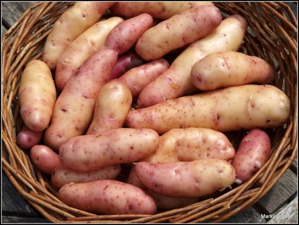 ” Pink Fir Apple is one of the oldest maincrop varieties still in use today, loved for its buttery waxy texture and nutty ‘new potato’ flavour. An odd looking spud, long and ‘knobbly’, but don’t let that put you off as they are delicious boiled in their skin, which you can peel off or eat!!”
