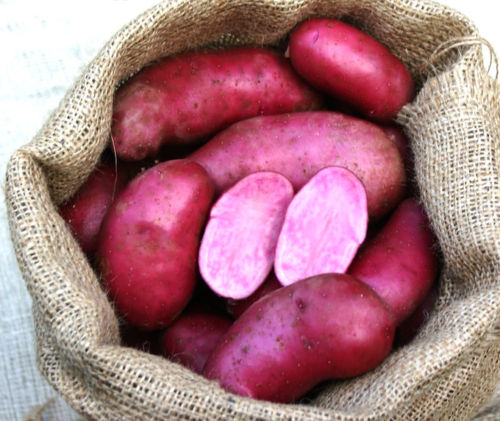 A truly stunning potato with smooth, long or oval red skinned tubers with matching deep red flesh with a paler ring just below the skin. The texture of Red Emmalie is relatively floury and the flavour is said to be excellent. Cooking suggestions include baking, boiling, roasting or steaming.”